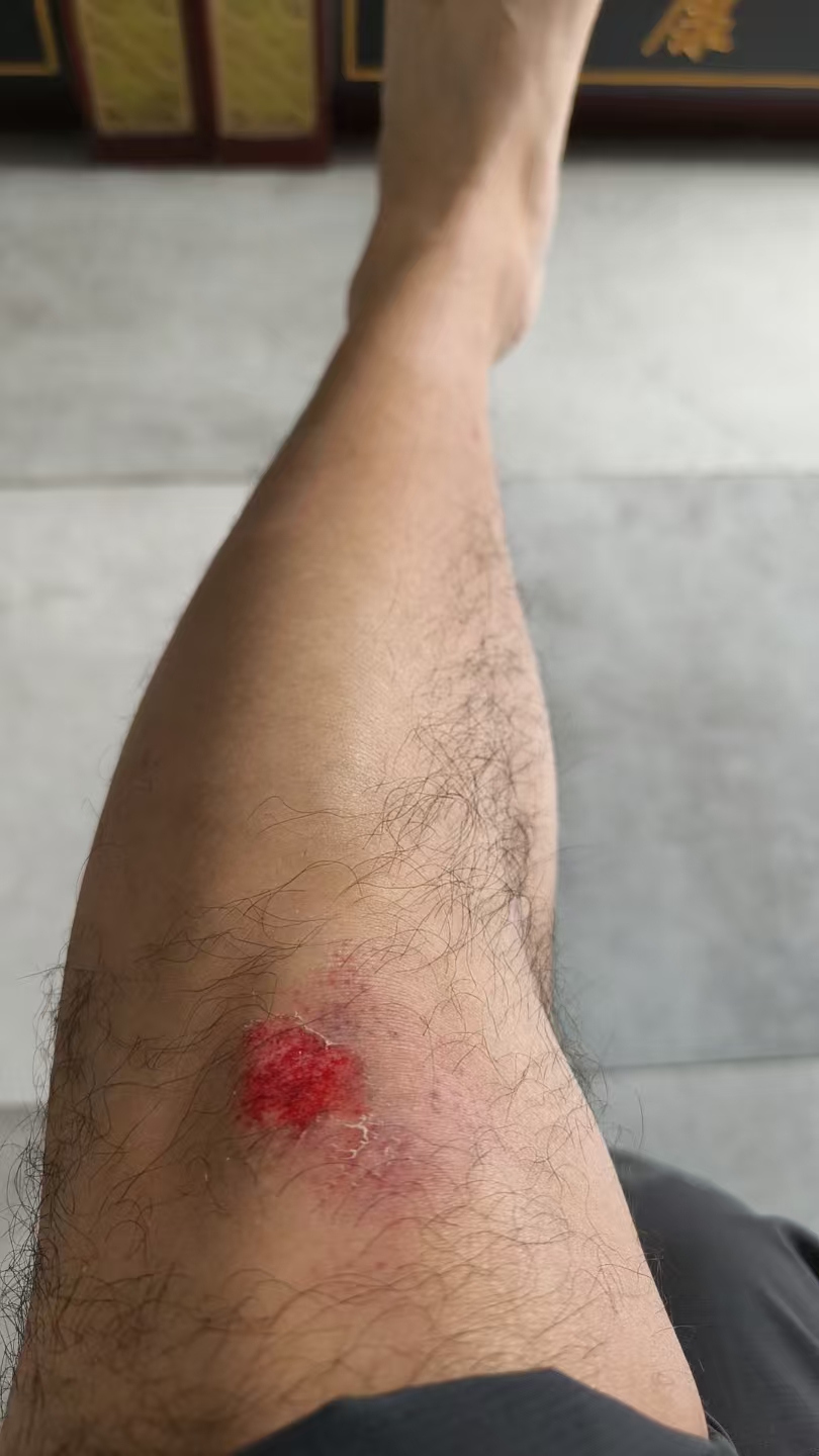 缓了下之后,继续骑行到家楼下,找了个诊所,消毒、贴纱布、回家。